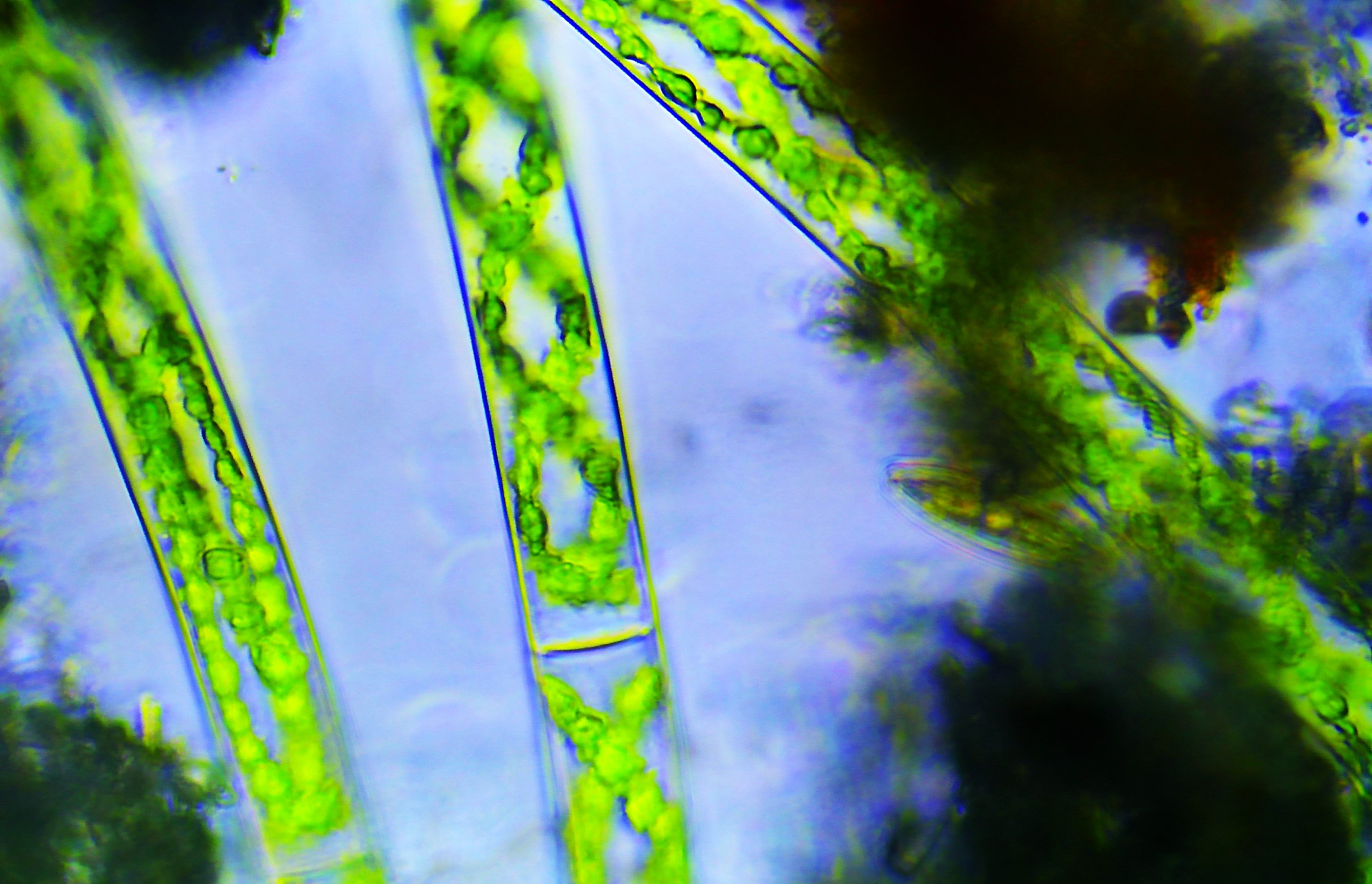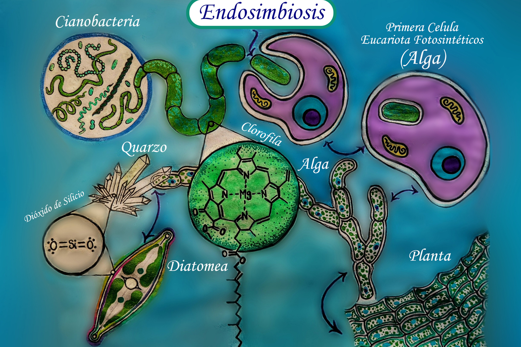 En la historia de la evolución vegetal, las cianobacterias entraron en la membrana de una célula más grande mediante un proceso conocido como endosimbiosis. Al vivir dentro de una célula más grande, las cianobacterias estaban más protegidas, mientras que la célula más grande estaba dotada del poder de la fotosíntesis. Esto creó las primeras algas. Las algas unicelulares evolucionaron hasta convertirse en algas multicelulares más complejas. Con el tiempo evolucionaron hasta convertirse en toda la vida vegetal del planeta. Las algas también evolucionaron hasta convertirse en diatomeas. Las diatomeas son un microorganismo fotosintético con una capa de dióxido de silicio. El dióxido de silicio es la misma molécula que el vidrio o el cuarzo.