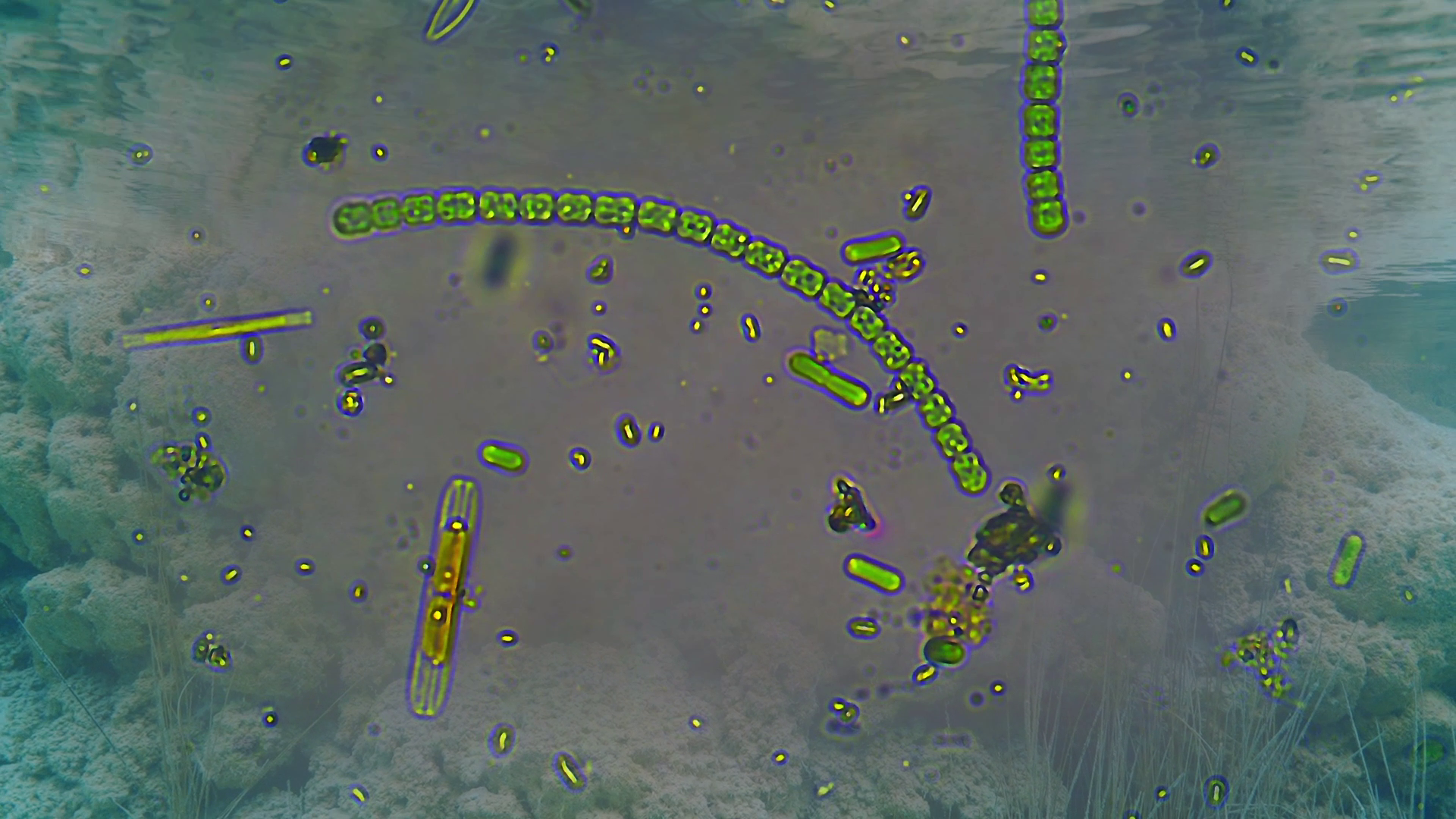 Hace 3,500 millones de años, dentro de los océanos primordiales de la tierra, las cianobacterias fueron los primeros organismos fotosintéticos del planeta. Son la raíz de toda la evolución vegetal. Su pigmento verde se debe a la clorofila, la molécula que absorbe la luz solar para iniciar la fotosíntesis. Las cianobacterias forman los estromatolitos al recolectar sedimentos de piedra caliza en su moco. Dentro de los estromatolitos prospera una colección increíblemente biodiversa de cianobacterias. Aparecen de muchas formas y demuestran una amplia gama de comportamientos diferentes.